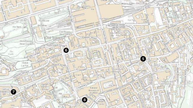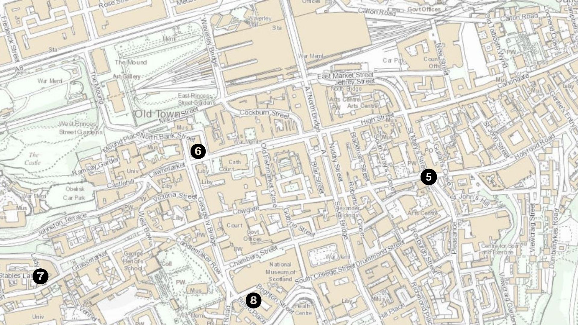 Kuten edellisessä osassa, olen merkinnyt esittelemäni paikat kartalle sekä vuoden 1765 karttaan että nyky-Edinburghin karttaan samalla numerolla. Otsikon linkistä pääsee katsomaan tarkemmin vuoden 1765 karttaa.